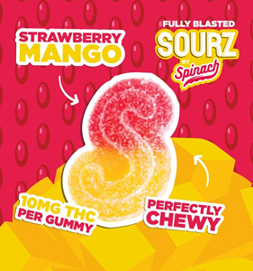Prepare for blast off! SOURZ by Spinach® Fully Blasted Strawberry Mango gummies are action-packed with 10mg THC per piece. Bring on thundering bursts of flavour with luscious strawberry and tropical mango! This dual-flavoured gummy is over-the-top with natural flavours and blasted with sour crystals. Enjoy 10 gummies per pack, 100mg THC total.
